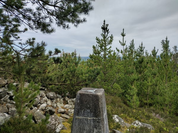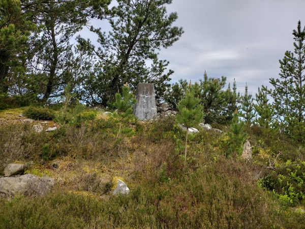 After a battle with the terrain, you will find the trig in amongst trees, rocks and heather.